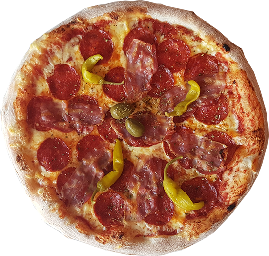 (rajčica, sir, kulen, panceta, gljive, feferoni, masline, origano)